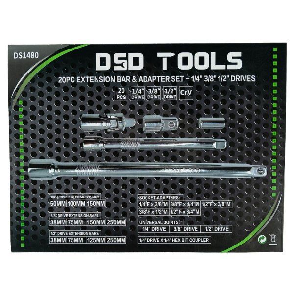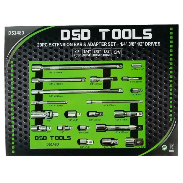 20PC EXTENSION BAR & ADAPTER SET – 1/4″ 3/8″ 1/2″ DRIVES DS1480