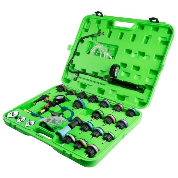 This kit is designed to help locate leaks in the coolant system by simply applying air pressure. It can also be used to quickly change the coolant using the vacuum purge & refill tool. The kit comes with a variety of radiator caps and adaptors to suit a wide range of domestic and import vehicles.