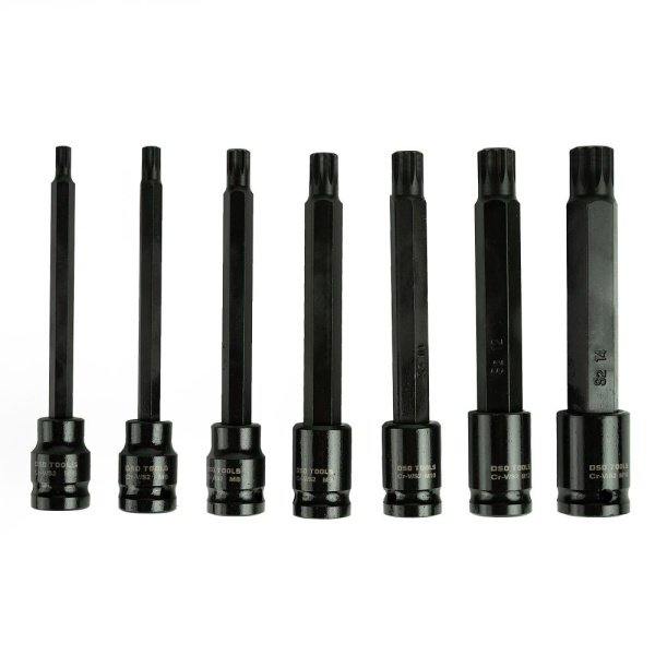 An seven piece set of extra long Spline bit sockets.