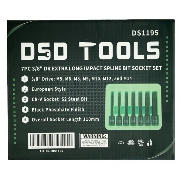 7PC 3/8″ DR EXTRA LONG IMPACT SPLINE BIT SOCKET SET DS1195