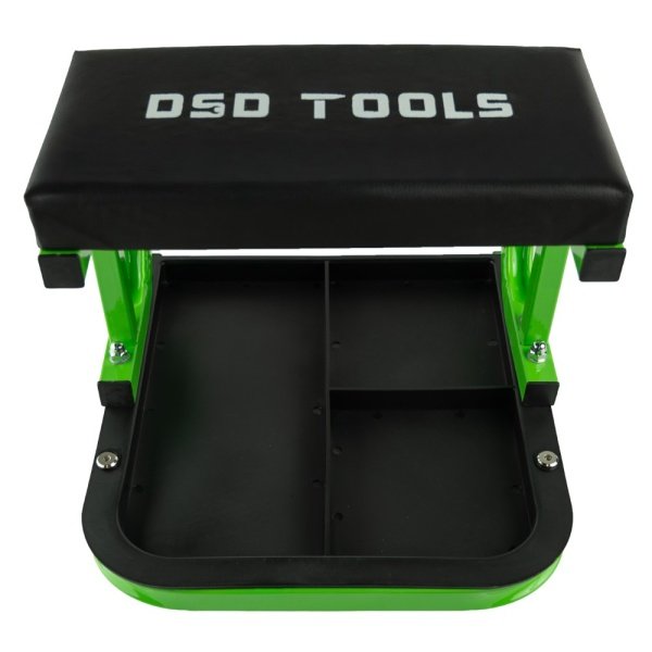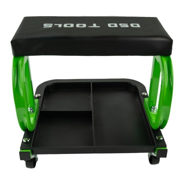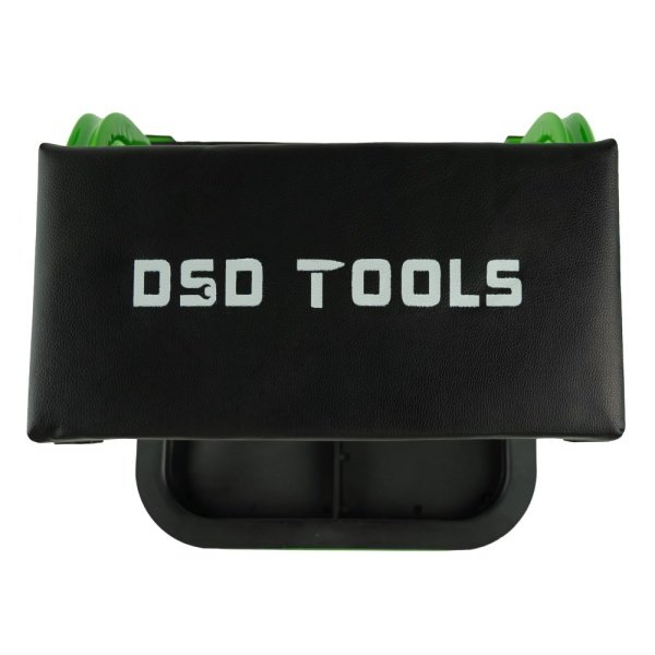 Black padded cushion with DSD TOOLS logo Storage Tray Swivel castors for mobility Green metal frame